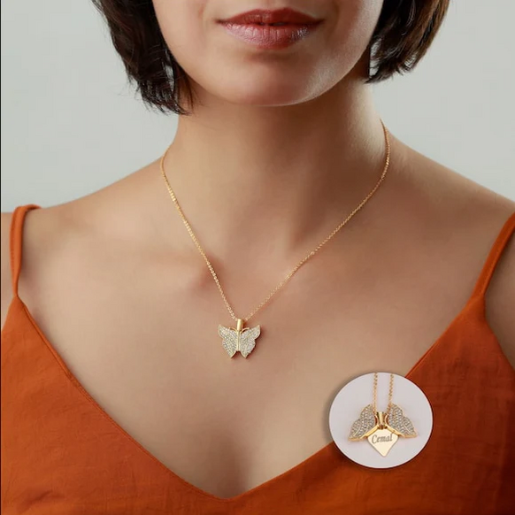 Bu kelebek kolye kanatları açıldığında güzelliği ve özgürlüğü temsil ederken, kanatları kapandığında ise içinde taşıdığı isimle birlikte romantizmi de çağrıştırıyor.