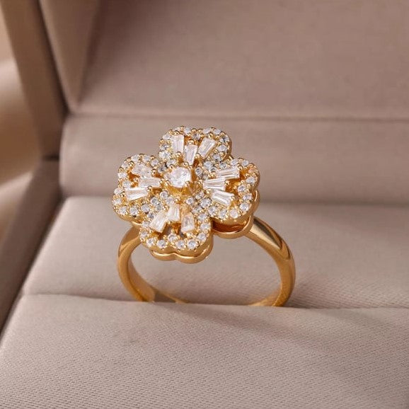 Dönen Yonca Yüzük, aşkın dört farklı yüzünü temsil eden zarif bir takı parçasıdır. Bu özel yüzük, dört yaprağı ile aşkın farklı boyutlarını temsil eder: