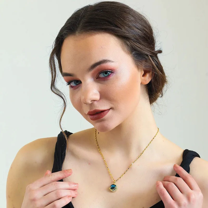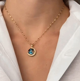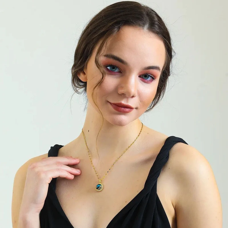 Kolyenin ucunda bulunan Mavi zirkon taşı, mavi renkli kristalize bir mineraldir ve genellikle güzellik ve refah gibi anlamlarla ilişkilendirilir. Bu taş ayrıca, berraklık ve sadakat gibi özellikleri simgeleyen bir doğal taş olarak da kabul edilir.